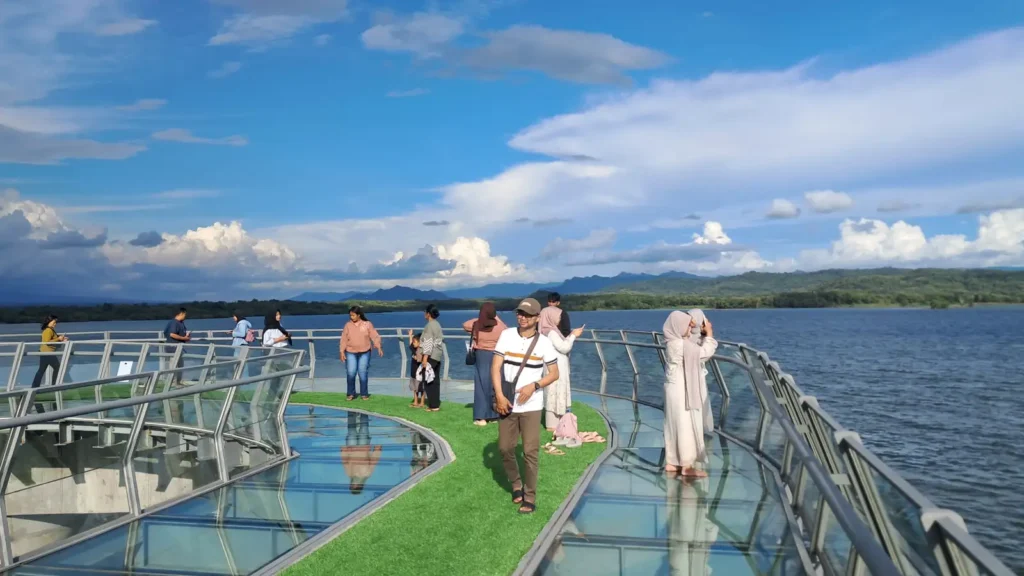 Jembatan ini menawarkan pemandangan Waduk Gajah Mungkur dan Pegunungan Seribu yang unik, di mana pengunjung bisa melihat perairan di bawah melalui lantai kaca yang transparan, sehingga memberikan sensasi menegangkan dan indah.